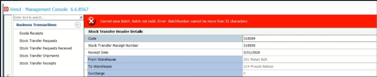 When the Customer attempted to receive the transfer and selected the batch for products, the error “Batch Number cannot be more than 32 characters” appeared.