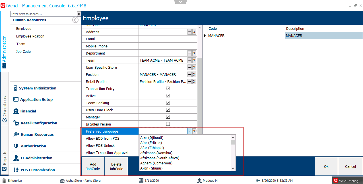 After completion of above steps, the Administrator has to make the user specific language settings as well in iVend, for every individual employee that will require the specific language.