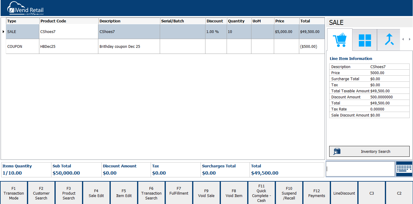 Version 6.6 and not the version-specific Query We would like to know if there is any configuration so that a coupon can be applied more than once to a line in the same transaction. Response We have checked and verified below scenario on iVend Retail ...
