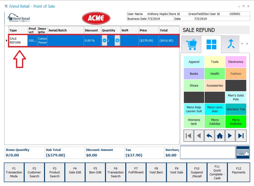 3. Go to the iVend POS and select a transaction against which the user would like to perform a refund: