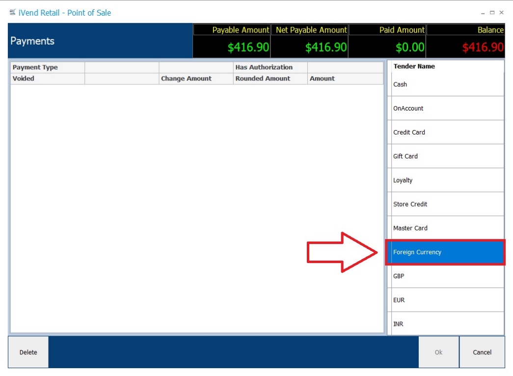 The user at the POS can now receive payments through the Foreign Currency Payment Type by selecting the tender on the Payments window as shown in the following screen images: