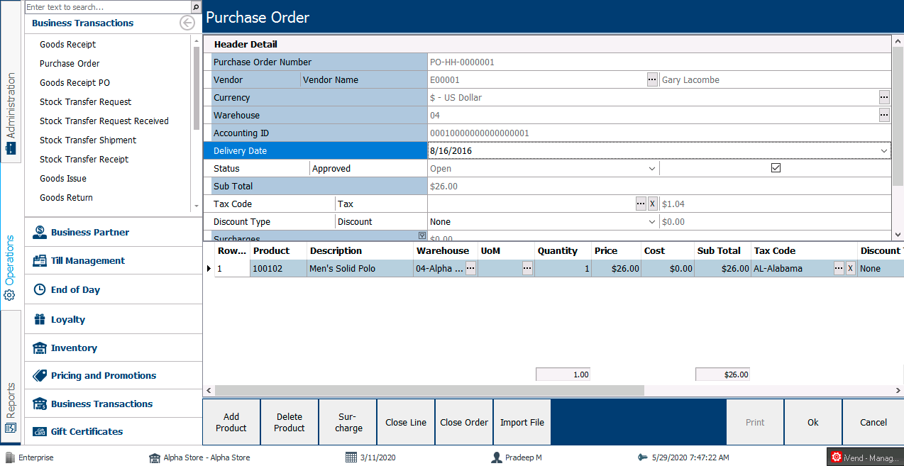 1. Specify the Vendor code that we created earlier and other relevant details as needed. Choose [Ok] to save and to add the Purchase Order to the system.