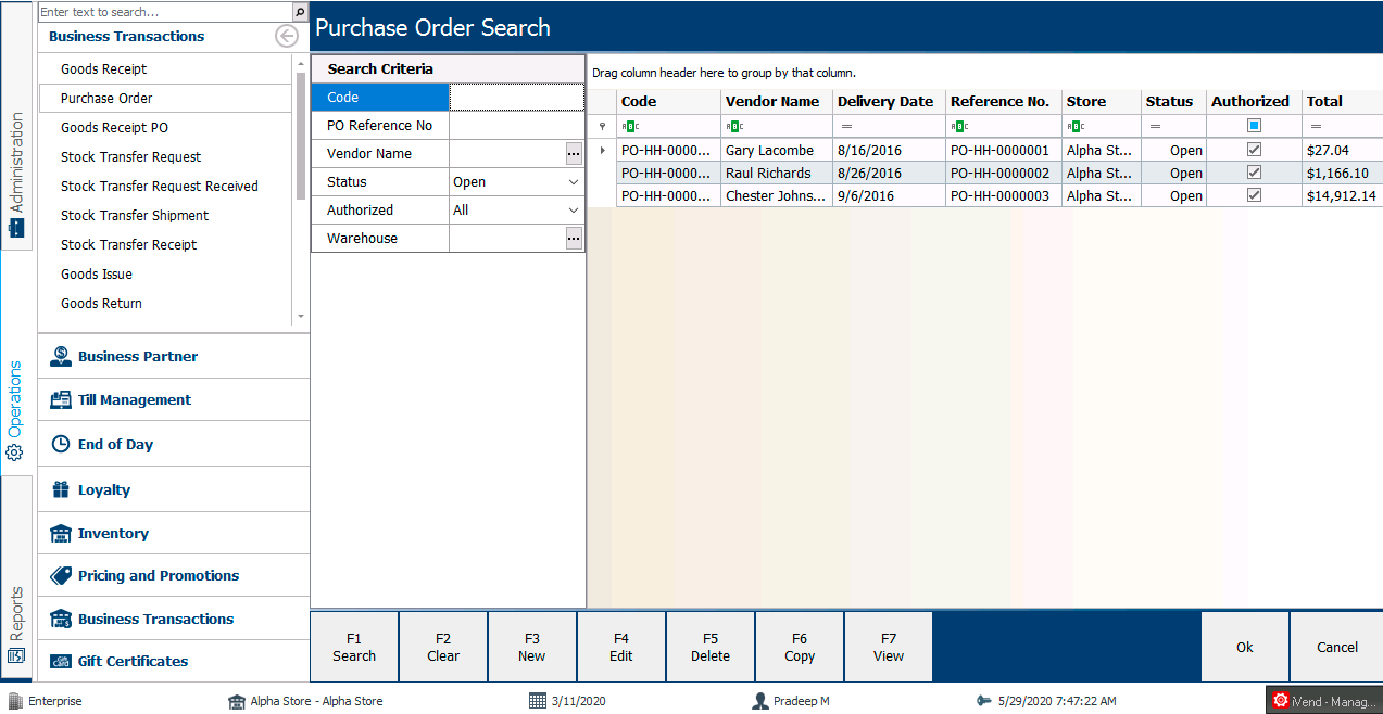 In iVend Retail POS, the system allows users to create Vendors, Purchase Orders and Goods Receipt POS at the Franchise owned and Franchise Operated stores.