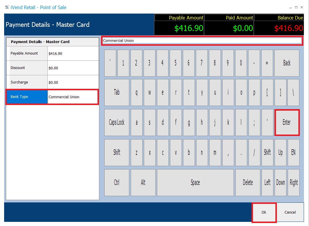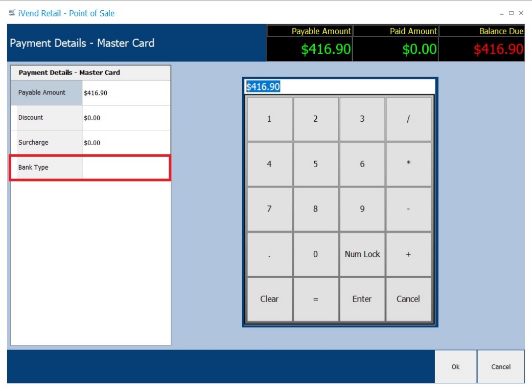 At the iVend POS Payment screen, select the Custom Payment Type, Master Card as created earlier in this article – the Payment Details – Master Card screen opens and we see the Attribute, Bank Type on the screen that we created for this Custom Payment Type. Remember that we set this Attribute as ‘Is Required’ therefore, it will be mandatory to enter a value in this field.