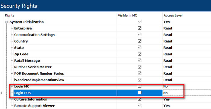 6.Expand System initialization row and find the option Login MC and Login POS. Here YES means User has a right to Login the MC or POS and NO means User doesn’t have right to Login the MC or POS