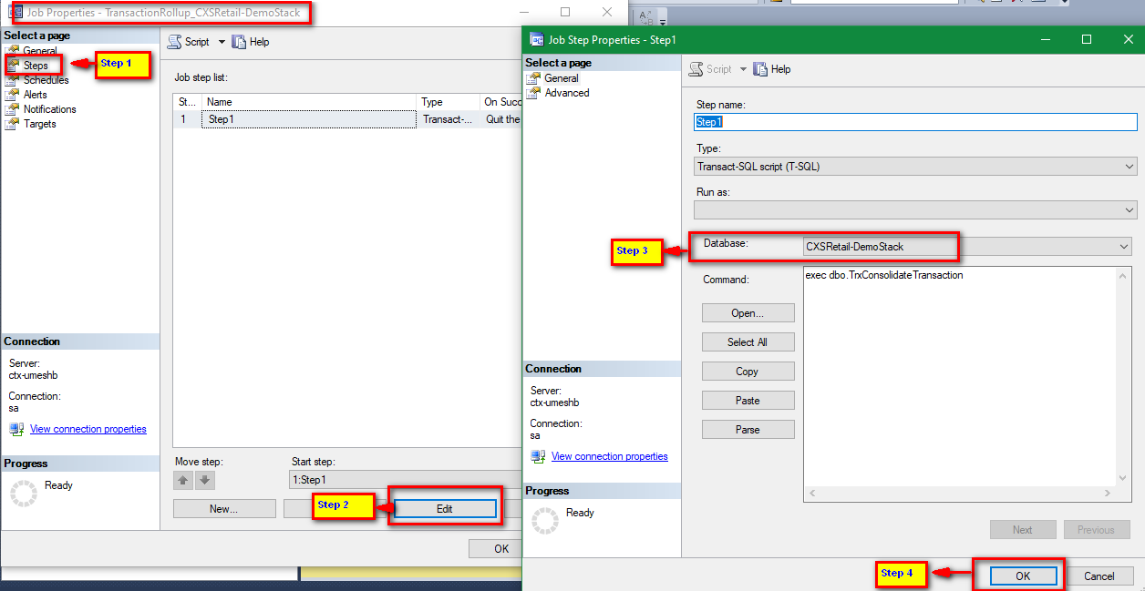 To see the Database name: Right-click on the Job "TransactionRollup_CXSRetail-DemoStack" >> Properties >> Steps >> Edit >> Select the correct Database name from the List >> Click on OK