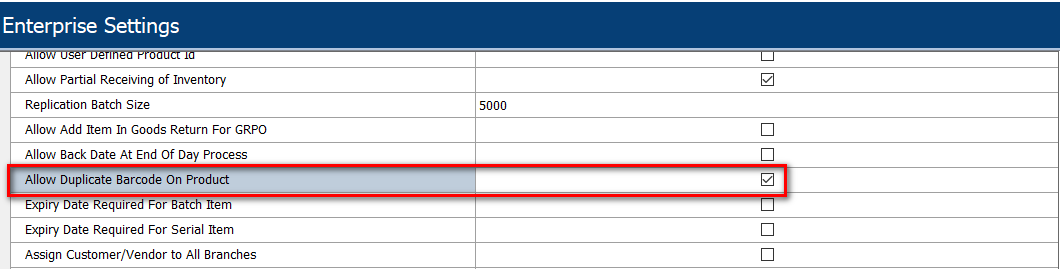 To allow duplicate barcodes in iVend, go to the Management Console, Enterprise Settings and then enable the option “Allow Duplicate Barcode on Product”
