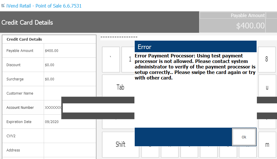 Payment processor giving error while taking payment on POS with payment type Credit Card